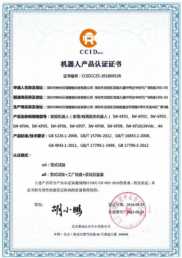 機器人產品認證證書